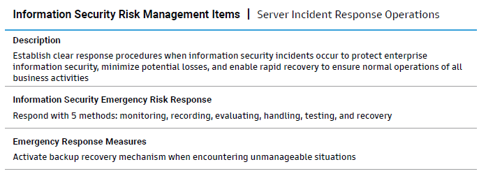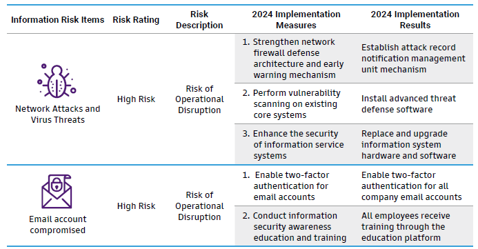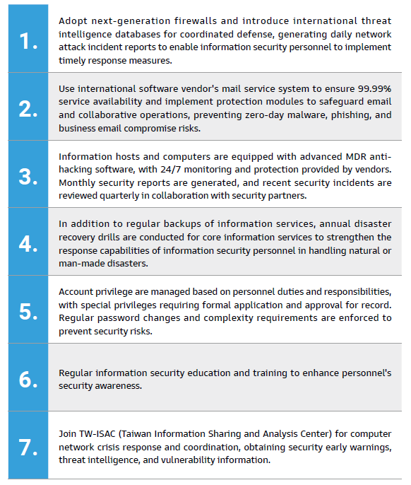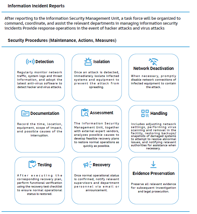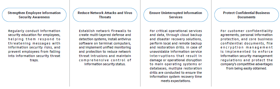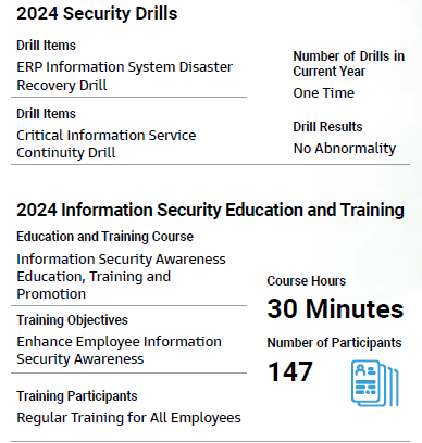 Establish information security-related methods and operational rules such as Information Security Policies and Objectives, Information Security Management Methods,and Information Security Emergency Event Management Regulations, continue security-related verification and regularly implement various crisis drills, strengthen employee information security education and training, and enhance information security risk defense capabilities.