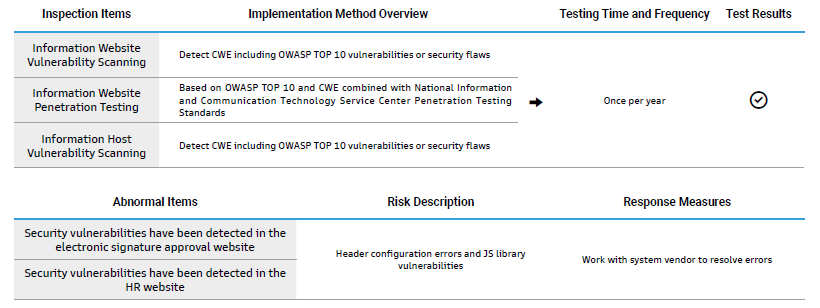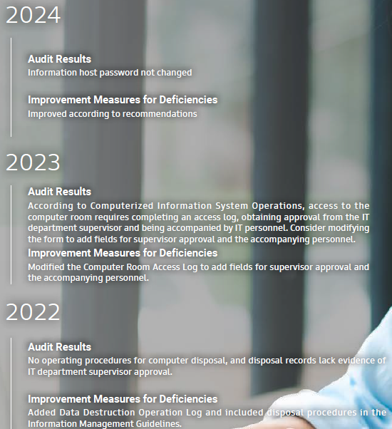 Therefore, regular information security inspections are conducted, and inspection reports are submitted to responsible supervisors for review. The findings and issues identified during inspections are understood, tracked, and reviewed for improvement to ensure that all internal and external personnel and units comply with the Information Security Policies and Objectives and Information Security Management Methods.