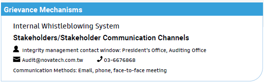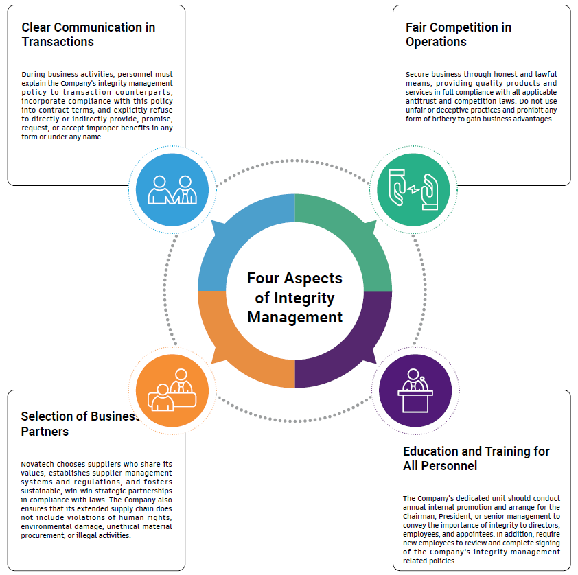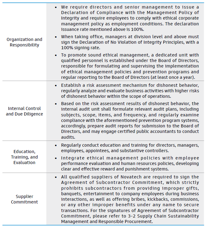 To foster a corporate culture of ethical management and sound development, Novatech's Board of Directors has approved the Ethical Corporate Management Best Practice Principles,Procedures and Behavioral Guidelines for Ethical Management,and Principles of Ethical Behaviors. By adopting these policies,the Company establishes the ethics and sense of responsibility expected of all employees in business operations, implements an honest and pragmatic management philosophy, and guides all employees to conduct business activities in line with high ethical standards, and ensures effective compliance with domestic and international regulations. The regulations include the Company Act, Securities and Exchange Act, Business Entity Accounting Act, Political Donations Act, Anti-Corruption Act,