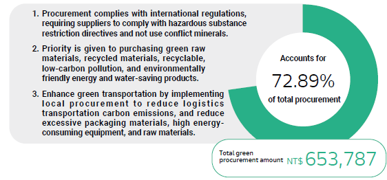 To promote environmental sustainability, Novatech upholds green procurement principles and strives to reduce the environmental impact of operational activities. We purchase office equipment with green environmental protection or energy-saving certification labels, promoting carbon emissions reduction. In 2024, the total green procurement amount was NT$653,787, accounting for 72.89% of total procurement, including replacement of inverter air conditioners with eco-labels, eco-friendly light tubes, energy-efficient fans, and green office supplies (such as recycled paper).