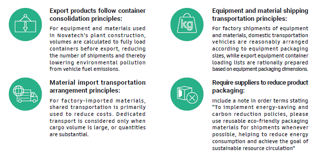 To promote energy-saving and carbon reduction policies and mitigate environmental harm caused by excessive product packaging or long-distance transportation, Novatech adopts green transportation principles by following these four operational guidelines.