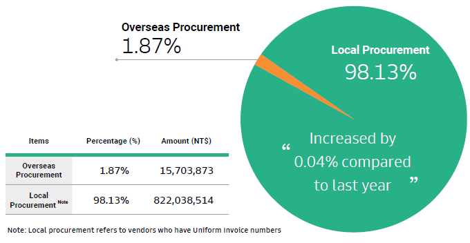 Suppliers and contractors are key business partners of Novatech. Through effective communication,close cooperation, and appropriate management supervision, the Company can work together with suppliers toward sustainable operations. We firmly believe that, as a responsible corporation, we should contribute to local economic development. Therefore, in line with the purpose of assisting local development and developing the local economy, we prioritize using local material suppliers and appointing local contractors when selecting partners for engineering projects. In 2024,Novatech’s local procurement from Taiwan regional vendors (note) was 98.13%. Due to shortages of foreign raw materials and significantly increased transportation costs, Novatech actively communicated with customers to promote local procurement, resulting in a 0.04% increase in local procurement ratio compared to last year’s 98.09%.