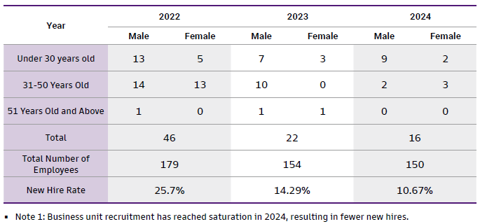 course matching, and internal referrals to strengthen organizational effectiveness and sustainable talent development. In 2024, a total of 16 new employees were hired, with a new hire rate of 10.67%. Among them, 68.75% of new colleagues were under 30 years old, continuously injecting new vitality into Novatech.
