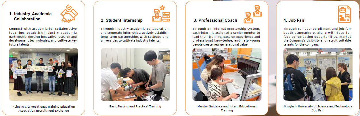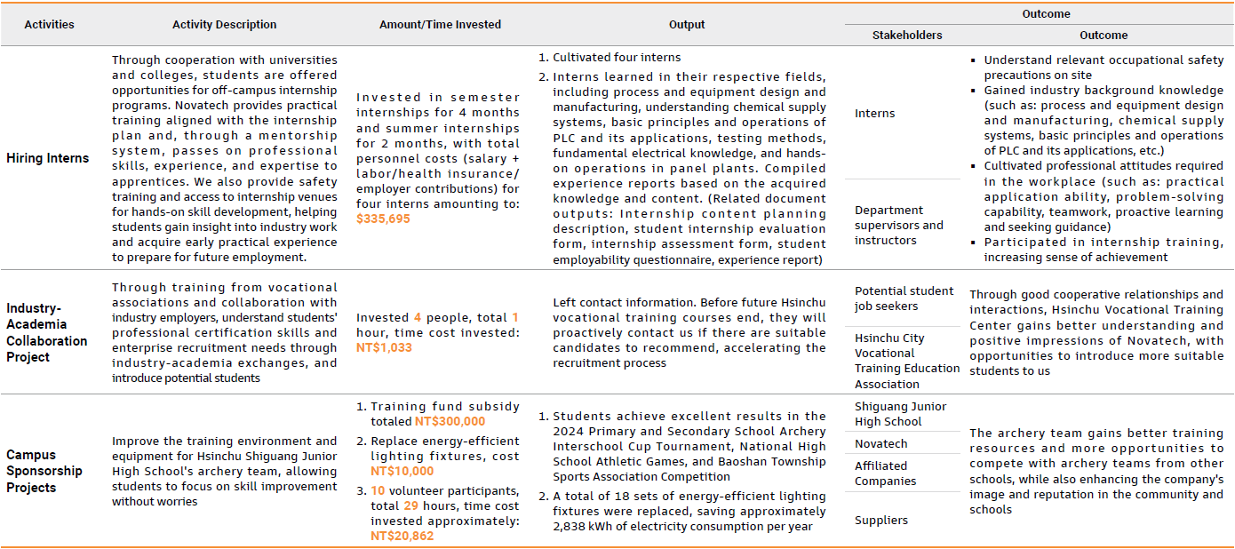 Talent is the key to breaking industry boundaries and driving momentum. Novatech is committed to nurturing young talent by actively recruiting outstanding students. With a diverse talent recruitment approach that includes campus recruitment, job banks, and employee referrals, we particularly emphasize signing internship cooperation agreements with colleges and universities to actively develop engineering talent. In 2024, we continued to organize corporate internship programs with an investment of NT$335,695. Adhering to the principle of mutual learning, we provide hands-on work experience to help young students gain familiarity with engineering skills and workplace practices, guiding them to explore future career paths from multiple perspectives.