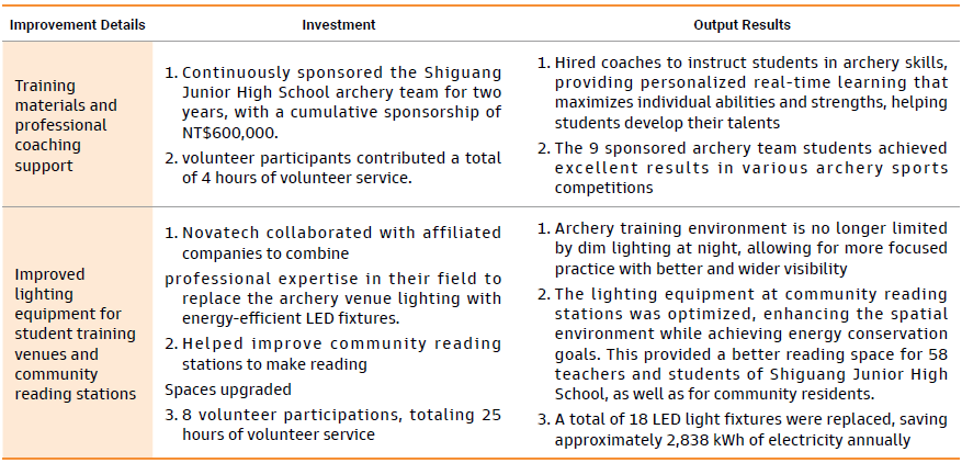 The Shiguang Junior High School archery team currently has 9 athletes, most of whom come from disadvantaged families. Despite outdated school equipment, budget constraints, and limited training resources, the team has consistently achieved outstanding results. In particular, during the 2024 Primary and Secondary School Archery Interschool Cup League, National Secondary School Sports Games, and Baoshan Township Sports Association Sports Carnival Archery Competition, the archery team members delivered excellent performances. Novatech hopes to continue investing to provide more resources for students to compete with other schools and stand out.In addition, Novatech's volunteer team also actively participated in this project, with a total of 8 person-times and 25 hours invested, demonstrating our persistence and commitment to social responsibility. Through this initiative, we aim not only to enhance the students’ training environment but also to foster a more positive and promising future for the community.