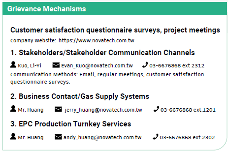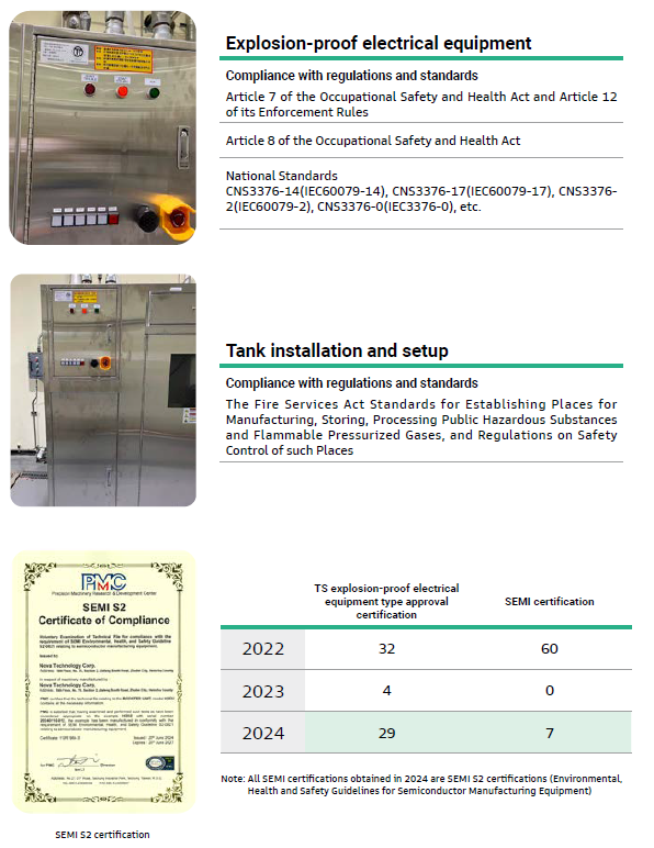 Novatech provides process supply system equipment for the high-tech industry. Our professional team designs products that meet customer requirements and comply with international or national safety regulations based on the customized conditions commissioned by customers. In accordance with Article 12, Paragraph 7 (Article 7, Paragraph 1 of the Act) of the Enforcement Rules of the Occupational Safety and Health Act, the Company's products have passed the ITRI TS explosion-proof electrical equipment type certification. In 2024, 29 products received TS explosion-proof electrical equipment type certification and comply with the national CNS standards. In addition to product design certification, engineering-related hazardous materials are also designed and installed according to the Standards for Establishing Places for Manufacturing, Storing, Processing Public Hazardous Substances and Flammable Pressurized Gases, and Regulations on Safety Control of such Places under the Fire Services Act, ensuring customer health and safety.