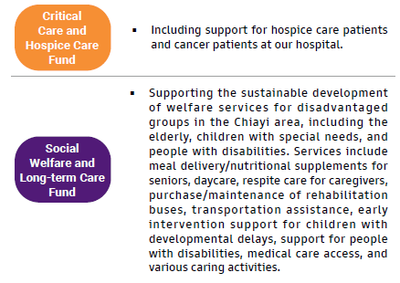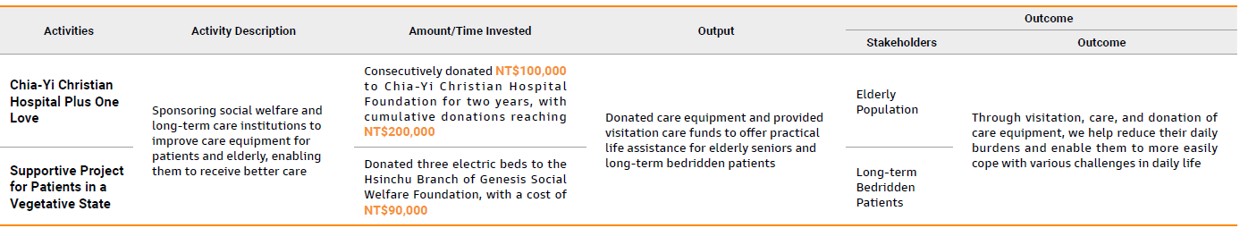Chiayi Christian Hospital has established a comprehensive community service system, offering home nursing, mobile medical care, health promotion, therapy for children with developmental delays, elderly home care, and meal delivery to support disadvantaged caregivers. To provide additional medical resources and ensure proper treatment for economically disadvantaged patients, Novatech has sponsored NT$100,000 annually for two years to the Critical Care and Hospice Care and Social Welfare and Long-term Care funds.Through these sponsorships and donations, we support groups in need of long-term care and promote public awareness and improvement of related social issues.