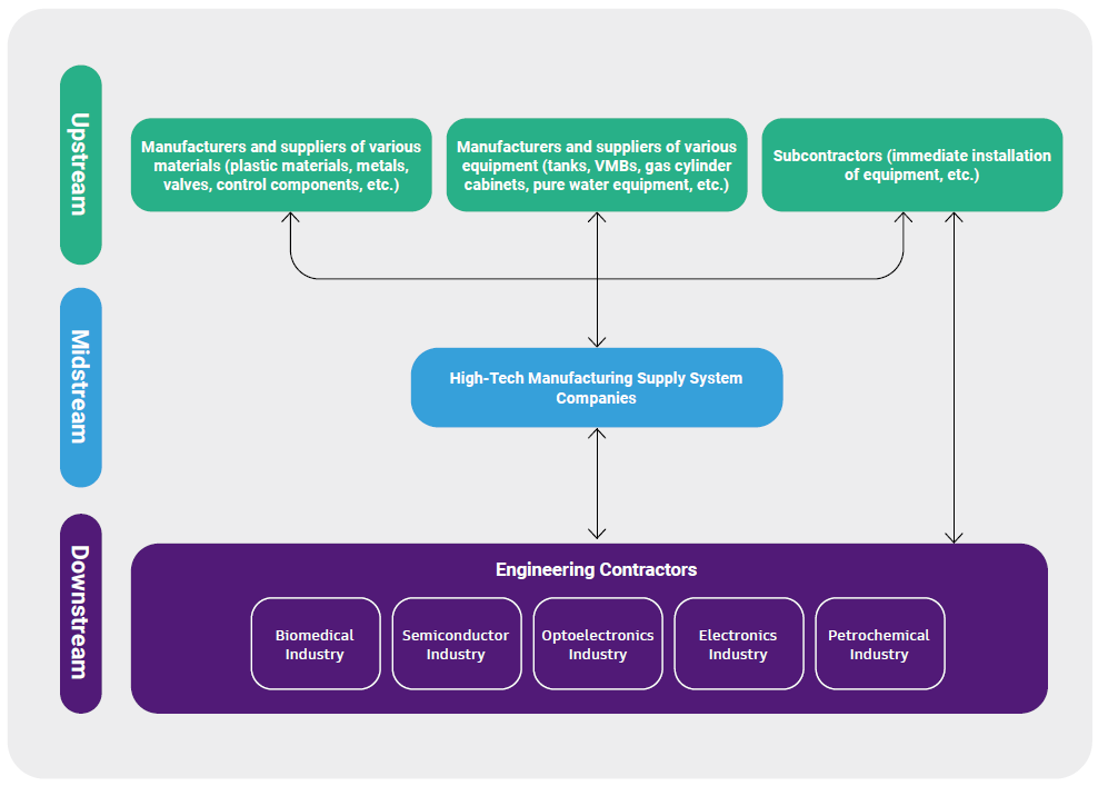 Novatech's suppliers can be divided into three categories: material manufacturers, equipment manufacturers, and subcontractors.The upstream, midstream, and downstream relationships are shown in the following diagram: