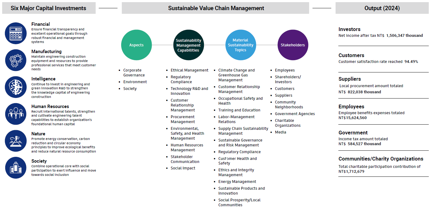 By utilizing six major forms of capitals (financial, manufacturing, intellectual, human, natural, and social), Novatech drives internal corporate sustainability management mechanisms to maximize operational profits and shareholder value while generating economic, environmental, and social benefits. In promoting organizational sustainability management, we enhance performance through multiple ESG management and maintain active communication with stakeholders. We actively promote sustainability management mechanisms to evaluate and manage the value created for stakeholders across the Company's entire value chain. Our goal is to maximize outcomes and jointly enhance the Company's sustainable value.