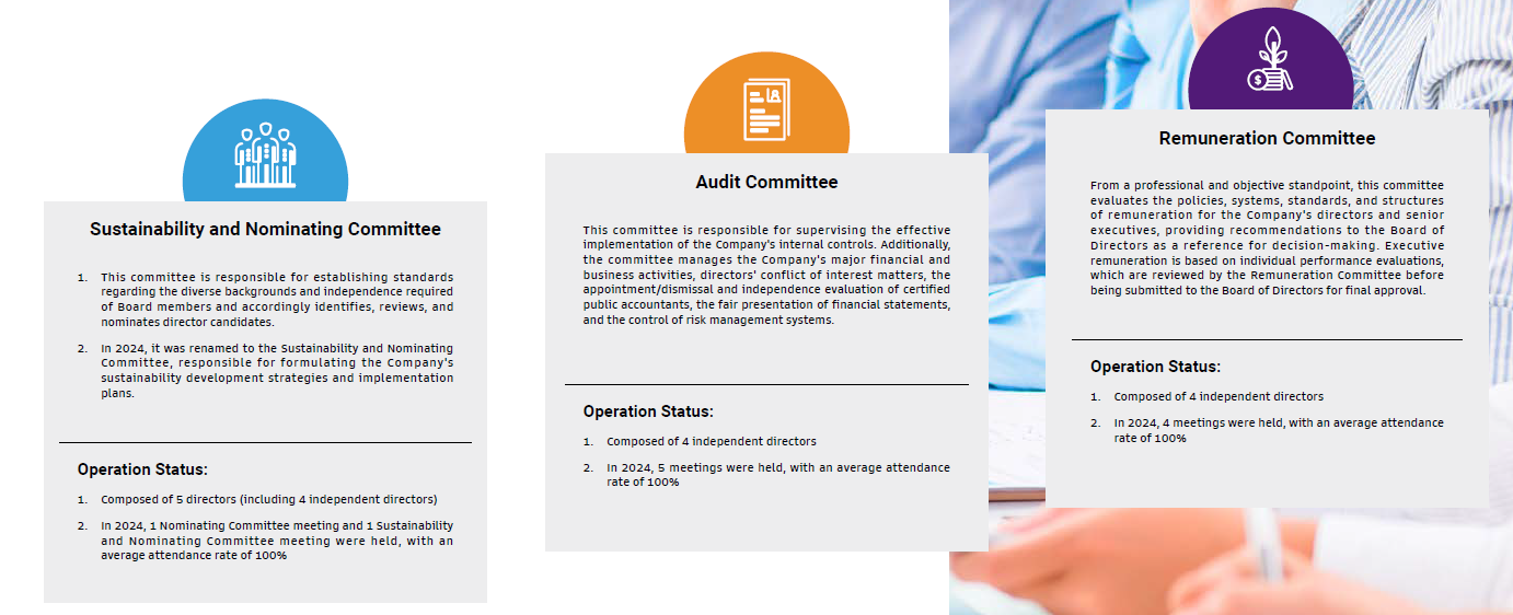 addition, Novatech has established three functional committees: the Audit Committee, Remuneration Committee, and Sustainability and Nominating Committee", which are responsible for reviewing important proposals and discussing significant issues related to economic, environmental, and social matters.