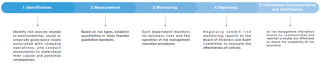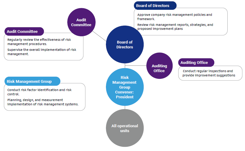 - The Board of Directors is responsible for supervising company operational strategies, developing strong business leaders,and safeguarding investor interests. The Board of Directors,Audit Committee, and Risk Management Group, establish risk management policies to identify and assess risks from different sources, and effectively monitor, prevent, or control them.