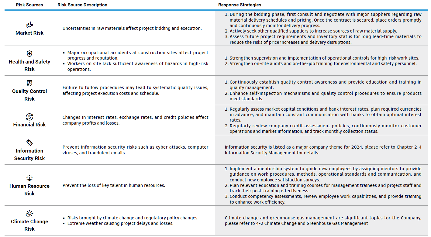 Based on the scope covered by the risk management framework, Novatech has identified significant risk items and assessed risk levels in its 2024 risk assessment results.Appropriate risk control methods have been selected to formulate response strategies and monitor the implementation of related plans to ensure their effective execution. The main risk management and response strategies are explained in the table below.