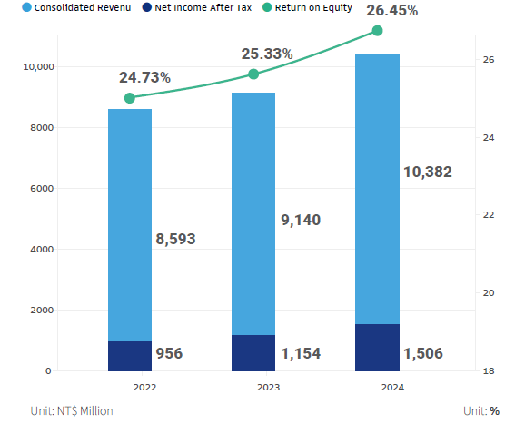 Benefiting from the robust development and active expansion of the semiconductor industry, Novatech's consolidated operating revenue in 2024 was NT$10,382 million,representing an increase of approximately 13.6% compared to 2023. In terms of profitability, the consolidated net profit attributable to the parent company in 2024 was NT$1,279 million, reflecting an increase of 22.7% compared to 2023.