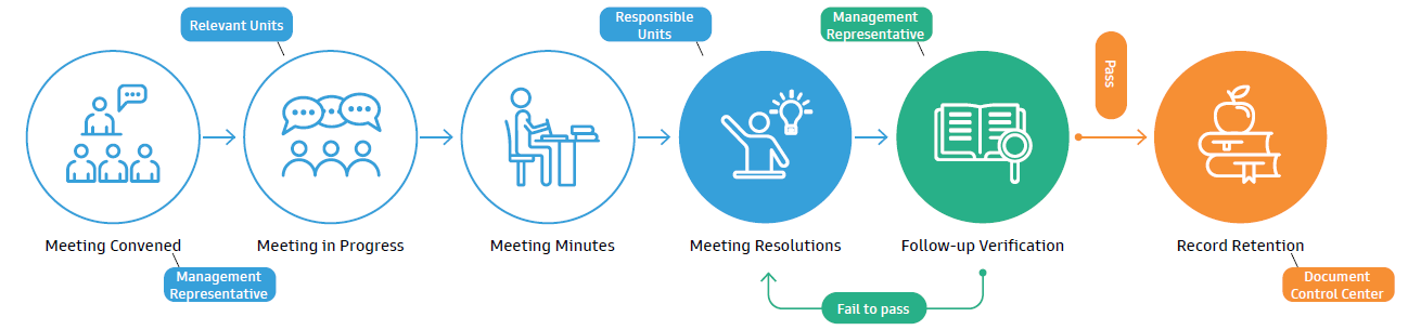 meeting discussions covers the Company's management system processes and the implementation of risk management measures. Senior executives lead the heads of various units in conducting management reviews and business assessments. In addition to designating responsible units for time-bound improvements based on meeting resolutions, all matters are formally reported to the President via written documents or immediate emails, and relevant personnel are assigned to carry out