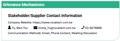 For new suppliers, in addition to collecting basic supplier information, we require them to complete a Supplier Evaluation Form. Selection criteria include product brands, engineering performance, waste disposal and treatment, workplace environment monitoring, construction quality certifications,regular fire safety inspections, and automatic inspection equipment. These are included as evaluation items. Novatech also specifies in order terms that any violation of relevant