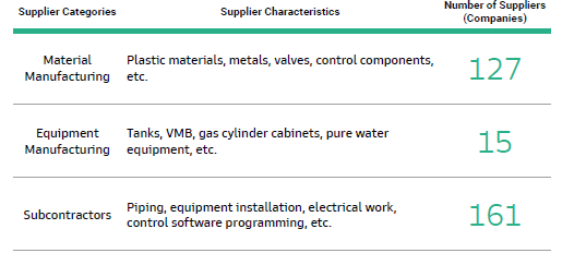 Novatech’s suppliers can be categorized into three categories: material manufacturing, equipment manufacturing, and subcontractors. We firmly believe that successful business operations rely on coexistence, co-prosperity, and mutual growth with supplier partners, and have always regarded them as strategic partners. Novatech’s main production and operational site is in Taiwan. To promote local industrial clusters and enhance regional economic development, except for some bulk chemicals that are technically controlled by overseas suppliers and cannot be procured locally, we have made every effort to choose local suppliers for collaboration. In 2024, there were 303 suppliers with transaction records.