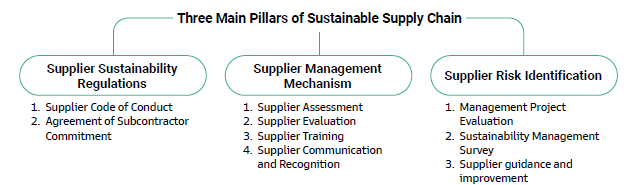 In addition to ensuring supplier product quality, pricing, and delivery times, the Company requires suppliers to implement corporate social responsibility, align with the United Nations Sustainable Development Goals, and maintain proper risk management and business continuity plans. The supply chain is divided into three main pillars:sustainability regulations, management mechanisms, and risk identification, implementing regulations and responsible procurement to jointly maintain a stable and developing supply chain.