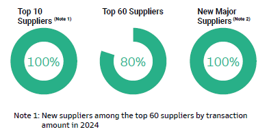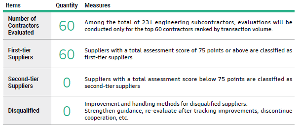 Through supplier EHS assessment, construction quality performance evaluation, and supplier ESG self-assessment questionnaires, Novatech provides guidance and improvement measures for suppliers with potential high risks to ensure effective risk control or reduction. The Company has 231 general contractors for engineering subcontracting. In 2024 evaluations were conducted for the top 60 contractors based on transaction volume.