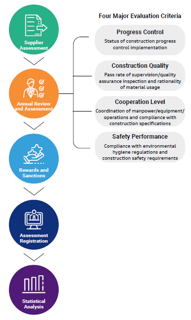 We have established a comprehensive supplier evaluation and responsible procurement mechanism as the basis for selecting excellent contractors. We regularly conduct quality assessments and replacement evaluations of contractors based on four main criteria: progress control, construction quality, construction